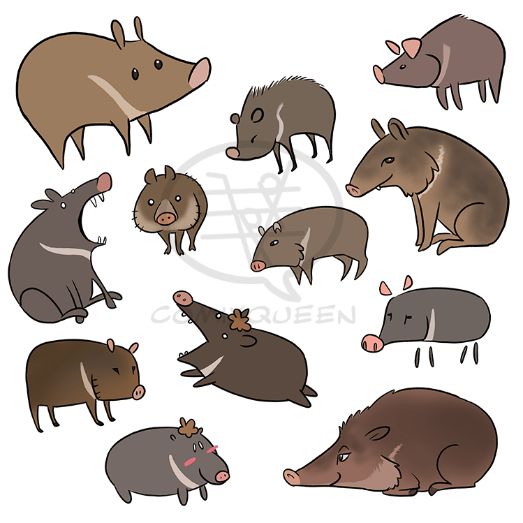 These were an interesting bunch to draw, mainly because… peccaries are still around. The features I like most about these animals are their giant heads, fluffy cheeks, pointy teeth, and especially their white collar markings. I tried to keep these features as a constant, while still looking for new ways to draw them. Peccaries are shaped like potatoes on skinny little toothpick legs, so stylizing them is always lots of fun.