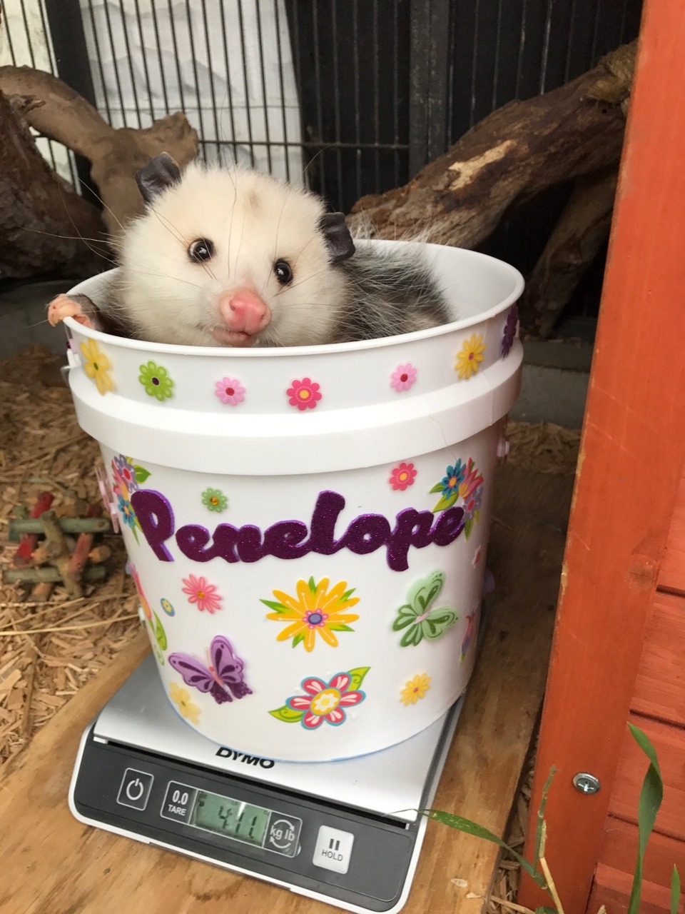 This is Penelope, the opossum at the zoo where I work l, sitting in her “weight bucket” so we can keep track of how much she weighs. She is a very good girl.